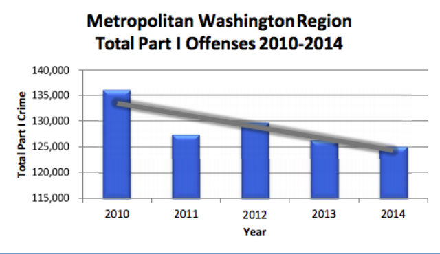 Overall, the D.C. region has seen a steady 8.2 percent decrease in crime since 2010, despite a spike in crime in D.C. proper. That can be attributed to significant decrease in crime in the communities surrounding D.C. in Maryland and Virginia. As the report says, environmental influences affect crime statics and trends