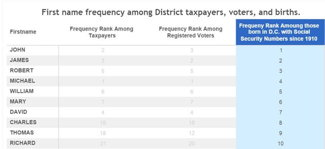 Those names correspond, albeit in a different order, to the number of registered voters (with the exception of Charles, which replaces Jose on that list). The authors also sorted the most popular names for District natives, at least those born in D.C. proper since 1910. The top ten, in order was: John, James, Robert, Michael, William, Mary, David, Charles, Thomas, and Richard.
