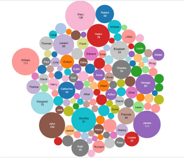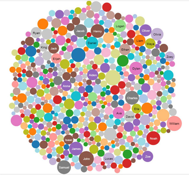 Once done with that, you can see how unoriginal your original baby names are using an interactive bubble chart of name frequency (evidently, the Zoe/Zoeys, Kings, Avas, Olivers, and Elijahs born in 2014 are likely to run into classmates with their names). Scrolling back a few decades, though, and you’ll see how certain names once completely dominated the field, whereas there is much less overlap in today’s world of bespoke baby names.