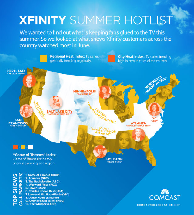 Of course, the necessary caveat is that these figures are only representative of Xfinity customers. They also don’t include shows only available on Netflix, Amazon, or Hulu or factor in online watching. With that said, here’s how our TV habits so far this summer stack up to the rest of the country.