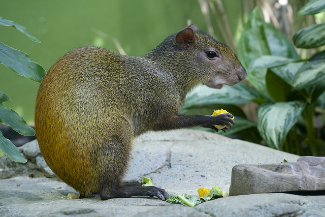 According to the Zoo, the greenish-brown agoutis typically weight between 6.6 and 13 pounds and grow to between 19 and 25 inches in length. Curiously, they have four toes on their front feet, but three on the back ones. They live between 15 to 20 years in human care, and are native to French Guiana, Guyana, Suriname, Trinidad and Tobago, as well as parts of Venezuela, Columbia and Brazil. Evidently they are also the only other species known to be able to open the husk of a Brazil nut.