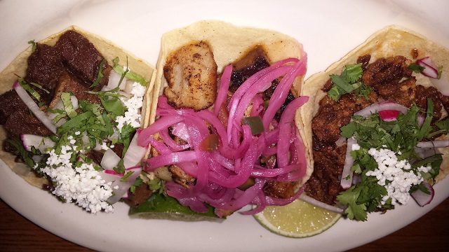 Impala Cantina’s lengua (tongue), pancita de puerco (pork belly), and chorizo tacos. Photo by Andrea Adleman.