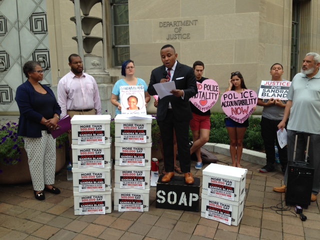 Soon after that phone call, Wilkins—a mother of four—started a MoveOn.org petition calling for Attorney General Loretta Lynch to investigate Bland’s death. Since Wilkins started the petition—just days after Bland was found dead in her jail cell on July 13—it has garnered nearly 400,000 signatures. Wilkins and dozens of activists delivered those signatures, as well as more than 100,000 others collected by various organizations, to the Department of Justice this morning. They also delivered a clear message: change needs to happen.
