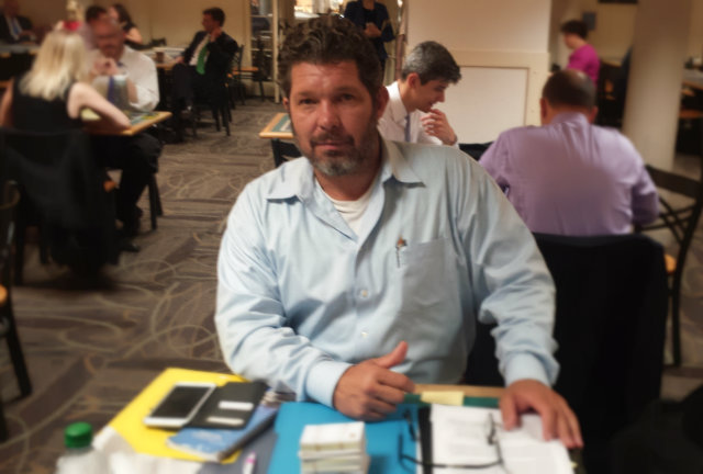 Chris Cox sits with piles of business cards in the cafeteria of the Longworth House Office Building. (Photo by Rachel Sadon)