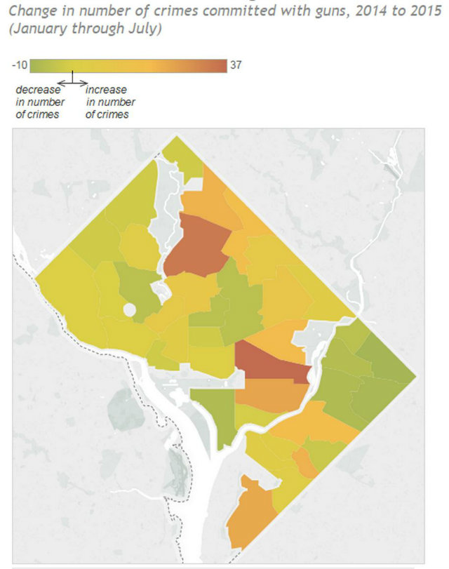 But now, thanks to District, Measured—D.C.’s Office of Revenue Analysis blog—you can see just what areas are experiencing the most violence. Pulling data on gun violence in D.C. between January and July this year and comparing it to the same time period in 2014, District, Measured found that such neighborhoods as Petworth, Brightwood, NoMa, H Street, Congress Heights, and more had the biggest increases.