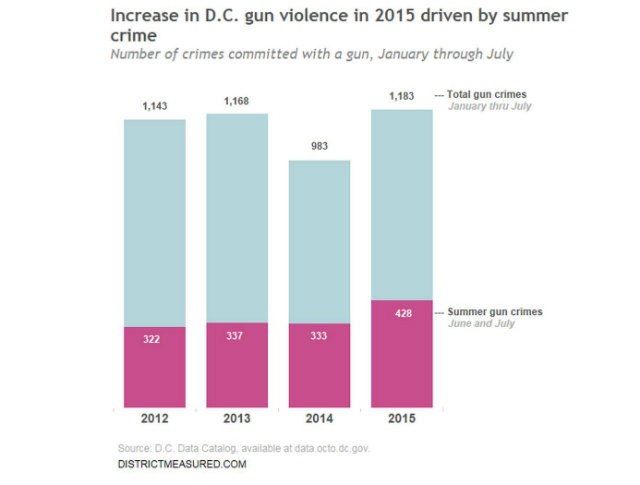 What’s more telling about this data is how the increase in gun crimes this year is mostly due to gun violence committed this summer. “Nearly half of the increase in crimes committed with guns this year is from an increase in gun crimes this June and July,” District, Measured’s Ginger Moored writes.