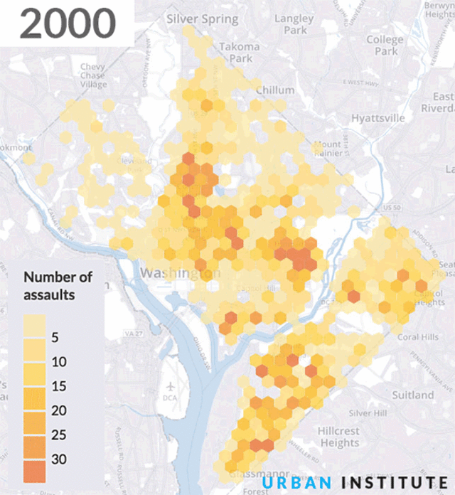 It’s not just homicides that have dropped dramatically over the past two decades. Bieler’s research shows that aggravated assaults declined citywide (though they remain high in some neighborhoods east of the Anacostia River). Meanwhile, domestic violence still accounts for a growing number of homicides; 17 in 2014 compared to just nine in 2012.