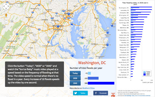 To illustrate just how dramatic the increase will be, Public Radio International has created an interactive map that renders the report’s findings into terms of ‘Ice Ice Baby.’ Click on a community and you can play the music video at the tempo that corresponds to the increase in flooding.