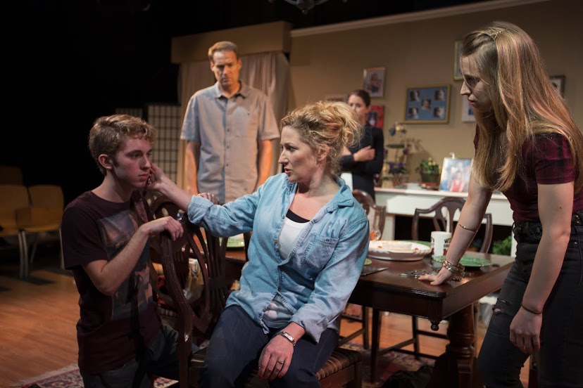 Marja-Lewis Ryan’s One in the Chamber, which is having its East Coast premiere at the Mead Theatre Lab at Flashpoint, is an unflinching zoom into the individual tragedies that comprise a national epidemic: accidental gun deaths. The play begins with a slice-of-life examination of Charles (Dwight Tolar) and Helen’s (Adrienne Nelson) idyllic rural home. Their daughter Ruthie (Grace Doughty) dances with abandon; Helen folds clothes; Charles reads the paper in his boxers; they worry about where their rebellious eldest, Kaylee (Danielle Bourgeois), disappeared to last night. The illusion of normalcy is neatly cracked by the arrival of Jennifer Schwartz (Liz Osborn), a social worker who visits the home to determine whether their teenaged son Adam (Noah Chiet) should be released early from his parole. His crime? Accidentally shooting and killing his younger brother, Joey, with the family handgun six years prior. What follows is a series of routine interviews that peels back the family’s thinly veiled turmoil.