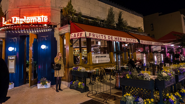The men proceed into Le Diplomate.