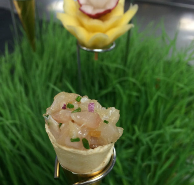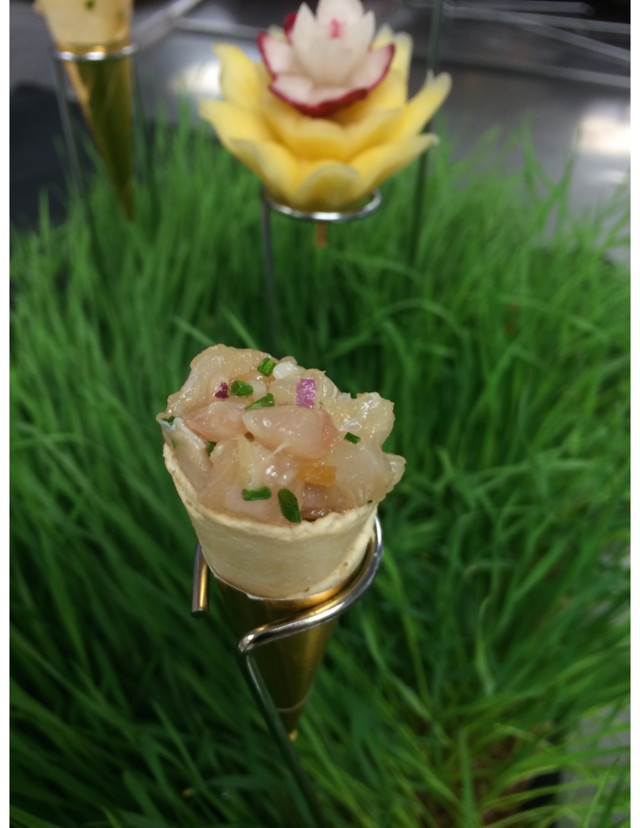 Xavier Deshayes, executive chef for the Ronald Reagan Building, uses invasive lionhead fish in appetizers like the Buddha’s Hand Scented Lionfish Tartare Cone. (Photo courtesy of the Ronald Reagan Building.)