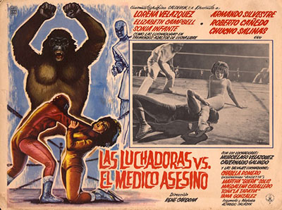 Based on a true storyMexican wrestling women; gorilla brain transplants. Either of those elements would make for an evening’s entertainment, but both!?! This must be the Washington Psychotronic Film Society. The movie’s alternate titles tell you all you need to know: Las Luchadoras Contra el Médico Asesino (Wrestling Women vs. the Murderous Doctor), Rock ‘n’ Roll Wrestling Women Vs. The Aztec Ape, and Sex Monster. Directed by René Cardona, auteur behind such films as the 1959 Santa Claus, Night of the Bloody Apes, and Wrestling Women vs. the Aztec Mummy, the movie stars Mexican screen queen Lorena Velázquez (Ship of Monsters, Santo Versus the Vampire Women).