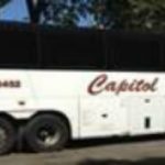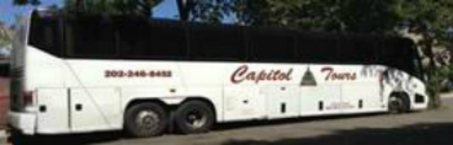 The two stolen tour buses are both white and have “Capitol Tours” painted on the front and sides in maroon and gold lettering. One bus was made in 1998 and has the license plate number B49077 and the number 210 on the front.