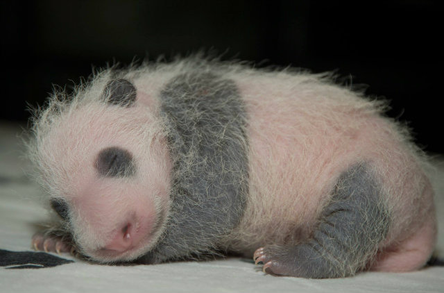 Though his eyes still won’t open yet (that doesn’t happen until he’s between 6 and 8 weeks old), he’s growing steadily, clocking in at 1.9 pounds. But this begs the serious question: is this panda cub cute as hell or what? I personally believe that yes, he is cute as hell. DCist Associate Editor Rachel Sadon says that he is not quite there yet, remarking that he “looks like a knock-off stuffed animal.”