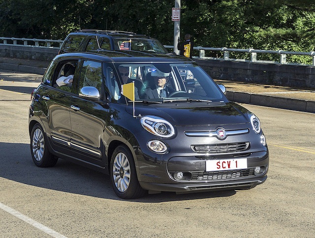 The Pope is getting around in a humble Fiat. Give him a wave if he passes by: