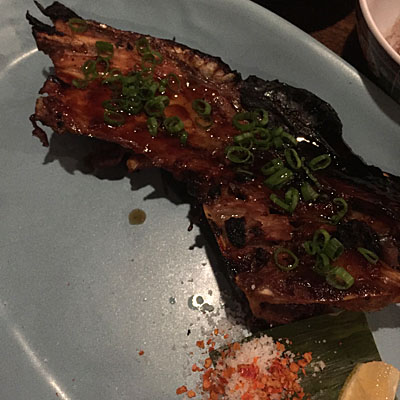 Inihaw na Panga ng Tambakol (Pat Padua). Finally, there is the Inihaw na Panga ng Tambakol, tuna jaw grilled in soy and calamansi (a kind of Filipino lemonade). This is at once the most physically challenging and intensely flavored dish we tried. You have to navigate your way through and underneath a remarkable bone structure, and once you get to the meat of the jaw its flavor is so powerful and delicious that you’ll forget that your Filipino parents grossed you out when they’d suck the meat from a fish head.