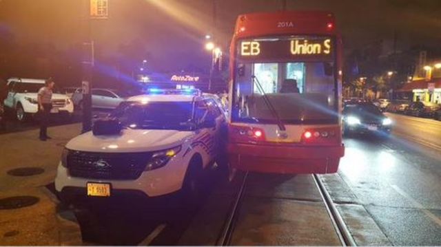 DC Streetcar into an MPDC car on H Street. #unsuckdcstreetcar #classic @DCist @unsuckdcmetro @DCStreetcar pic.twitter.com/ED4mc3ol4N