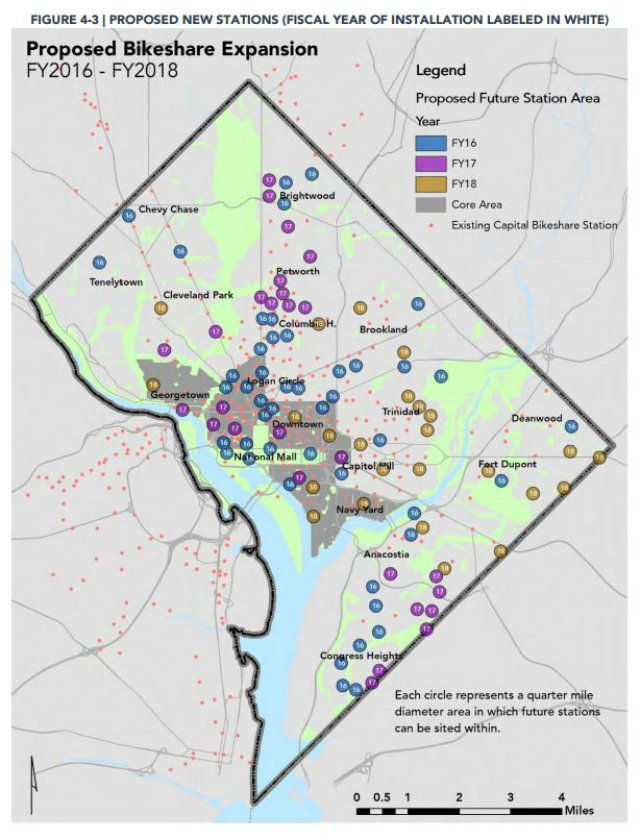 Currently, about 26,00 people have annual or 30-day memberships to the bikesharing system, and they are served by 202 stations in the District (there are 355 throughout the region.) Under the plan, that would jump to 249 in 2016, 276 in 2017, and 301 in 2018. Another 21 stations would be expanded, including busy hubs around the U Street Metro, Logan Circle at P Street, and Dupont Circle, in 2016 and 2017.