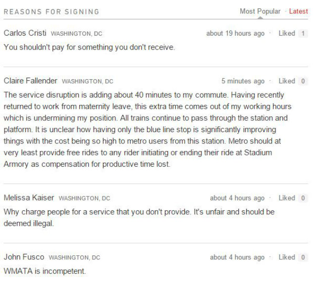 Austin Graff, a social media manager at Honest Tea, says he was once a huge fan of the Metro but “they now cause stress to its riders daily.” So he’s put his name on the record in an attempt to pressure the agency to at least change the fare for riders affected by the latest service changes. “I have doubts it will work, but it at least makes an official, collective statement to the DC Metro,” he said. “Then they can choose to act or not act on record.”