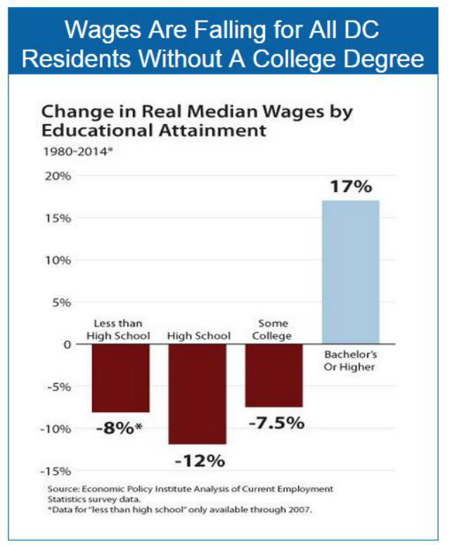 A D.C. worker with only a high school education made $2 more per hour in 1980 than they did in 2014, when adjusting for inflation. Meanwhile, Washingtonians with a college degree made $4.50 more per hour on average in 2014 than they did in 1980, according to a new report by the D.C. Fiscal Policy Institute.