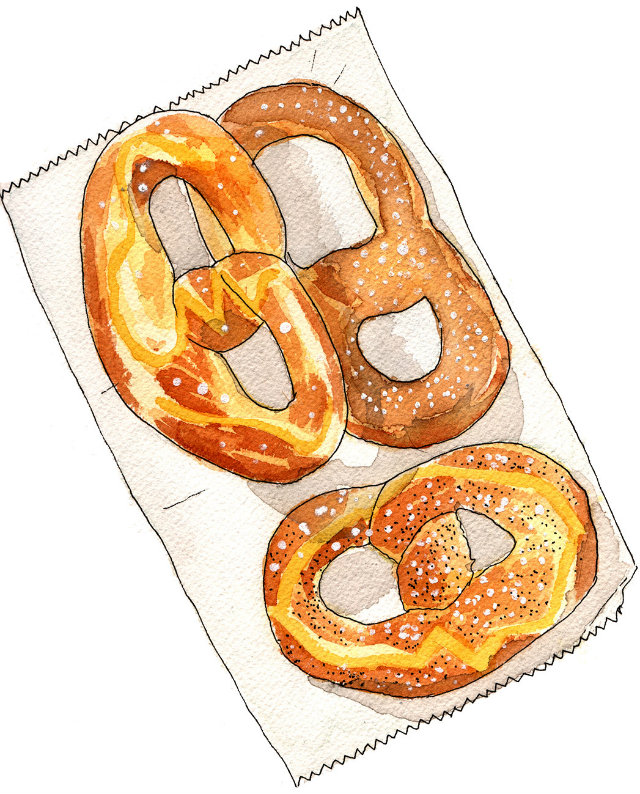 The three main kinds are salted, sweet (with a cinnamon glaze), and everything (poppy, sesame, garlic, onion, and salt). You can buy different to-go toppings from caramel mustard to cream cheese. They’ve also got breakfast rolls in the morning and Nutella-filled pretzel “bombs.”
