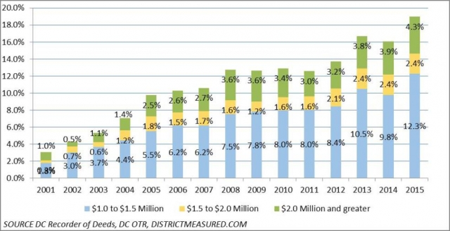 According to an analysis done by the the Office of Revenue Analysis blog District, Measured, $2 million homes are the new luxury. Since 2001, sales of homes valued at more than $1 million have seen a 15 percent increase in D.C.
