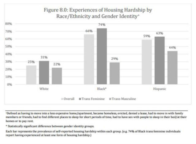 With regards to housing, nearly three quarters of black trans women and 66 percent of Hispanic trans women reported some form of housing hardship—defined as “having to move into a less expensive home/apartment, became homeless, evicted, denied a lease, had to move in with family members or friends, had to find different places to sleep for short periods of time, had to have sex with people to sleep in their bed/at their homes or to pay rent.”
