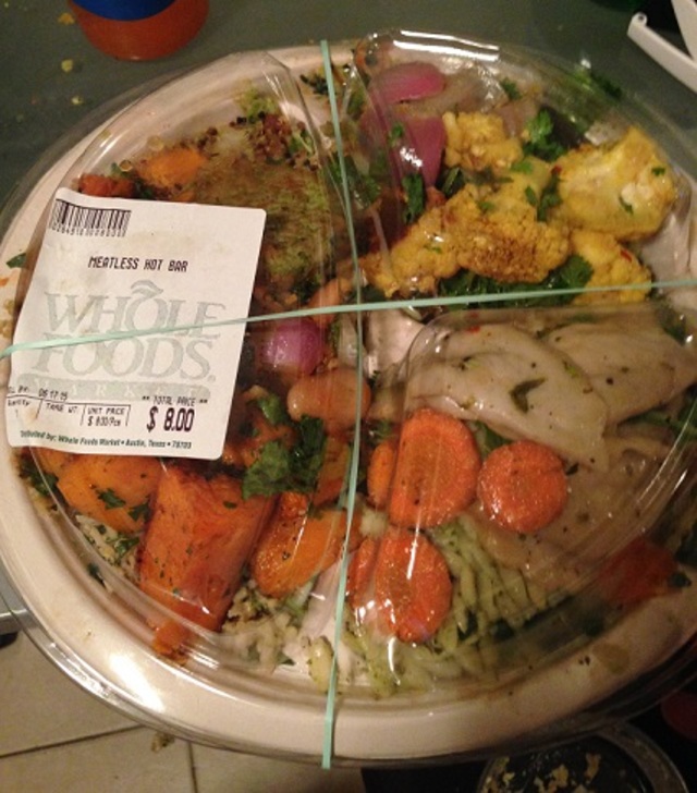 And that’s just the cold side of the equation. I prefer not to mix hot foods in my cold plate lest the steam from barbecue seitan strips wilt my romaine and the cream from the vegetarian lasagna seep into the Jamaican jerk rice salad. That just means a second, temperature segregated plate is in order. Hello sides for the week. I’ll probably eat them with animal protein later in the week, meat that Whole Foods got me to buy from them all because they got me to come in for their Meatless Monday promotion.