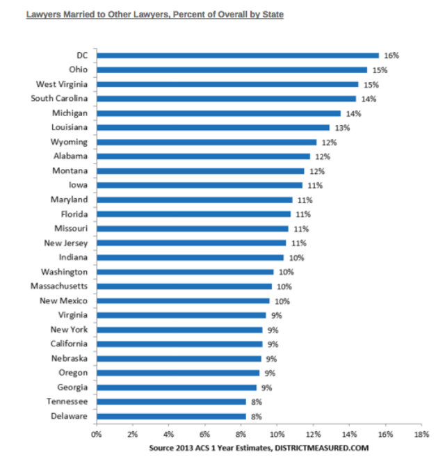 Lawyers account for about 3 percent of all occupations in D.C., and astutely enough, they manage to link up romantically. That’s right—D.C. topped the list of lawyers who marry other lawyers with 16 percent, compared to a national average of about 8 percent for all states, according to the blog’s data.