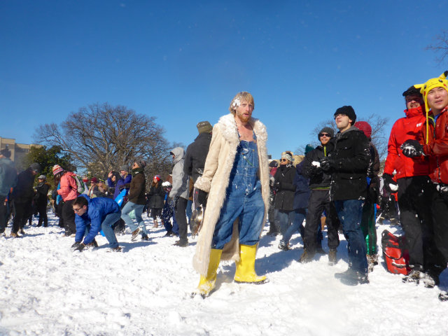 12:18 PM: A man with a megaphone announces a ten-second truce, “Gather your snowballs!” Everyone scrambles to prepare.