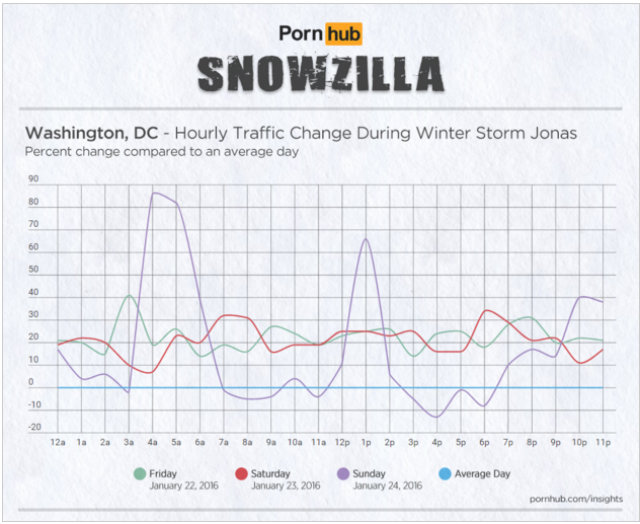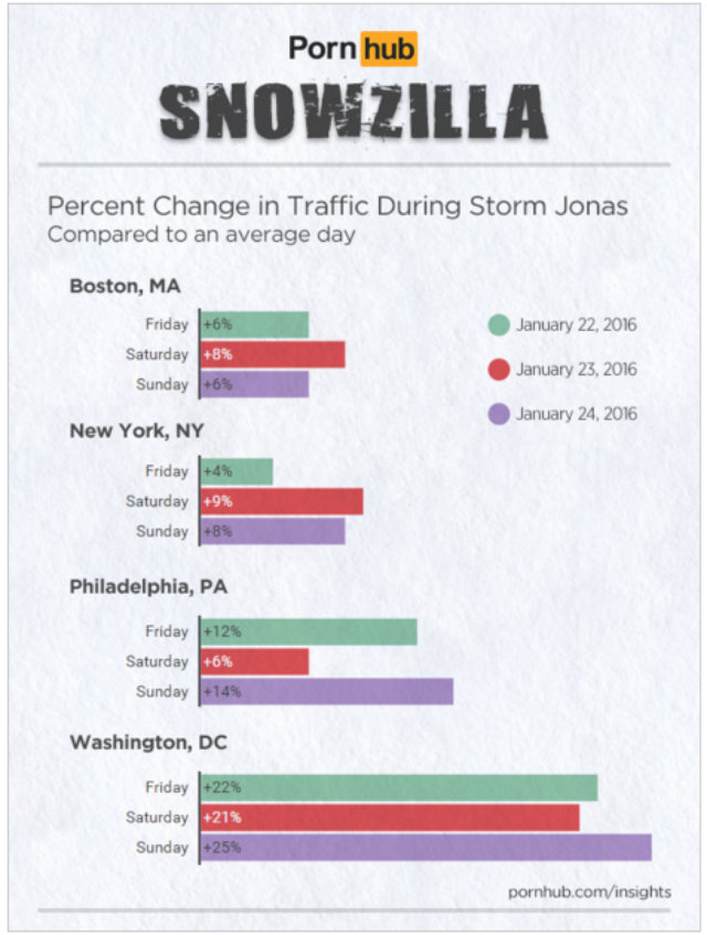 Per the request of GQ, which first reported the data, Pornhub looked into viewership in Boston, New York, Philadelphia, and D.C. over the storm’s three-day period.