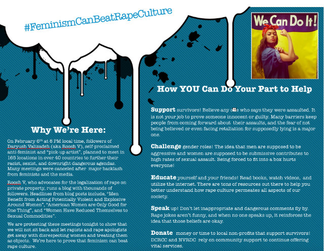 “Our main message is that feminism can beat rape culture,” says Faith Ferber, a junior at American University and the co-president of Students Against Sexual Violence. “There’s a debate over whether these meetings are still happening. Either we scared them into not showing up, or they can see that we’re not okay with their message. For us, it’s a win either way. “