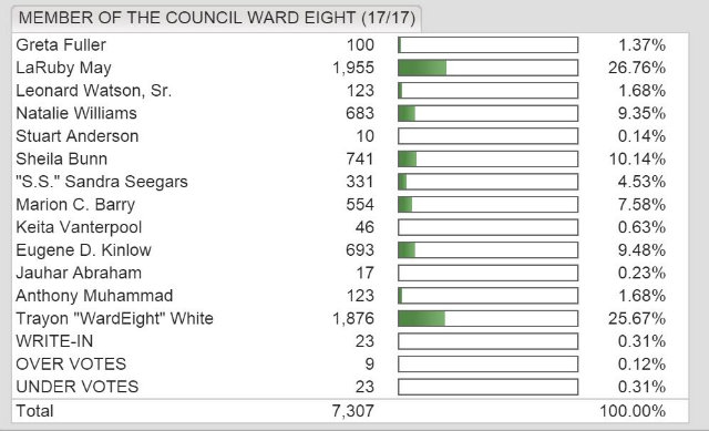 White lost to Councilmember LaRuby May in an incredibly close special election in 2015 by fewer than 100 votes. Both of them netted around a quarter of the vote in Ward 8 amidst a crowded field that began with 16 candidates and ended with 13.