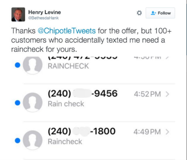 From 11 a.m. to 6 p.m. yesterday, if people texted “RAINCHECK” to 888-222 they would get a coupon for a free burrito at the newly e coli-free chain. Levine thinks the mix-up happened when some phones automatically added his 240 area code to the six-digit code Chipotle provided (plus an extra number).
