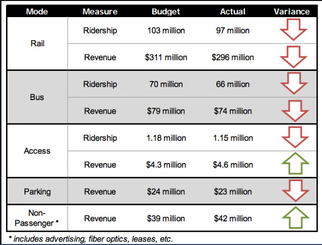 Passenger fares and parking fees are $18 million short of the projected budget so far.
