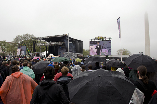 Eddie Izzard speaks at the 2012 Reason Rally, which was a rather rainy affair. (Photo by Chris Wieland)