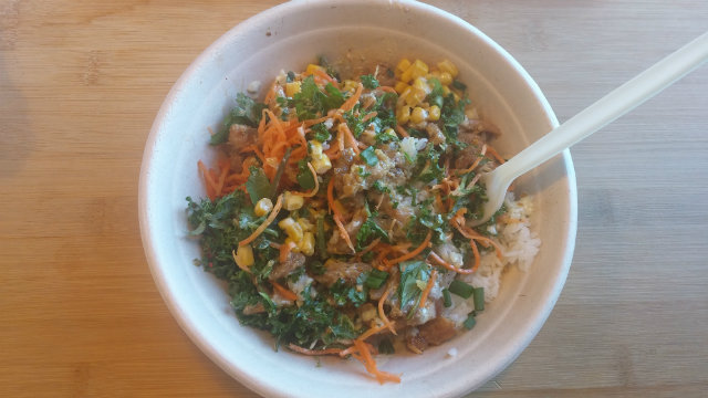 I ordered a signature combo, the Southwest Bowl. It had Kalbi chicken, corn, carrots, kale slaw, cilantro-lime ranch, crispy garlic, cilantro, scallions. While they suggest you try it with avocado, I didn’t because, to my dismay, it costs an additional $1.50, regardless of the free bowl.