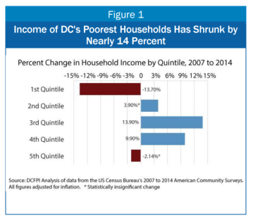 Right before the Great Recession, the poorest fifth of D.C. households earned just $10,800, when adjusting for inflation. Seven years later that figure fell by nearly 14 percent to $9,300. That is about equivalent to what low-income families earn in El Paso and Albuquerque—places with significantly lower costs of living.