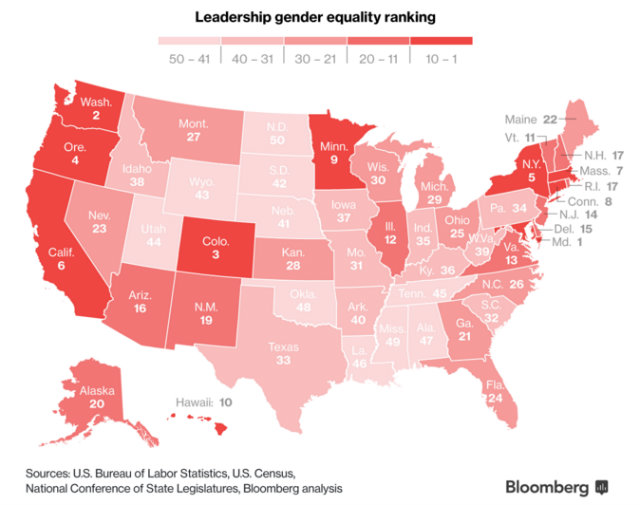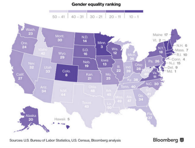 Bloomberg’s benchmarks for the study included female-to male pay ratio, female labor force participation, college degree attainment, health insurance coverage, and poverty.