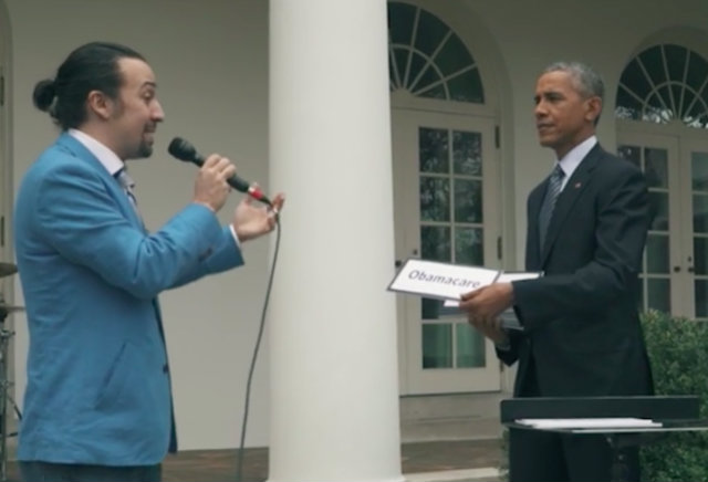 Hamilton writer and star Lin-Manuel Miranda showed off his freestyle skills yesterday with help from President Barack Obama. The President held up cards with random words like carbon footprint, congress, innovation, Supreme Court, immigrant, Oval Office, and the MacArthur-appointed genius strung them together in a two-minute Rose Garden performance.