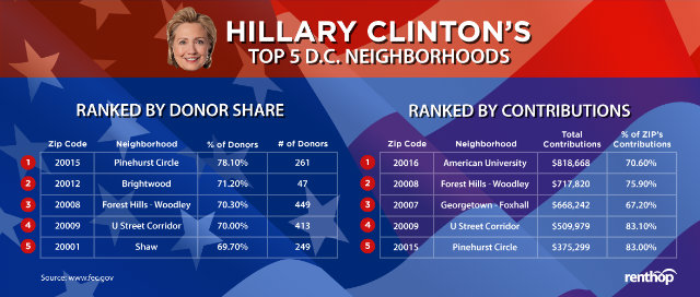Neighbors surrounding American University gave more than $818,000 to Hillary, $24,000 to Cruz, $21,000 to Bernie, $17,000 to Kasich, and $2,600 to Trump.