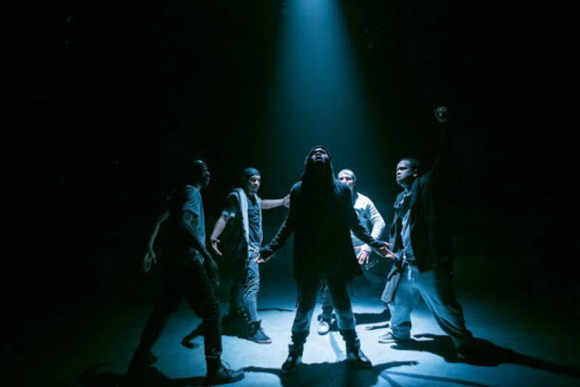 Though Joseph drew inspiration from Shange’s 1974 script when writing his in 2003, Word Becomes Flesh is not meant to be the male response to for colored girls. And, though Shange’s script was updated in 2010 to include the new stories about PTSD and HIV, in Anacostia, it is Psalmayene24’s interpretation (the first authorized update of the play without Joseph’s direct involvement) that speaks more directly to the present time and place. In one scene, four men lie head-to-toe, wriggling as if packed into a slave ship. One by one, they sit up, recalling the places where Laquan McDonald, Michael Brown, Akai Gurley, and Freddie Gray (among others) were killed by police, all within the last two years: “Chicago. Ferguson. Bed-Stuy. Baltimore.” The very last sounds of the play are a mash-up of voices chanting “Black Lives Matter” and “Hands Up, Don’t Shoot,” during which the actors exit and then re-enter the stage with their hands up, as if they’ve both won and lost the race referenced throughout the performance.
