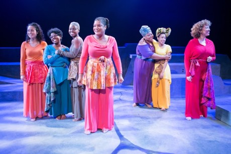 The marriage of movement and spoken word is also fully consummated in for colored girls, though this choreopoem strikes a slightly more, well, feminine tone. The women orbit fluidly around each other, each dressed in a different color of the rainbow. Choreographer Sandra Holloway’s dance training comes through, especially in a mambo scene, though there is power, too, in the relative stillness of six women when they train their focus on the seventh actress. In a play that shifts sometimes suddenly between joy and grief, David Lamont Wilson’s sound design carries the emotion along with riffs of jazz and Latin music, making occasional use of LaVette’s strong pipes.
