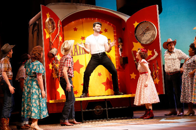 The show has two driving plot points—the young woman Lizzie’s (Olivera) quest to find a husband, or at least some self confidence; and the arrival of Starbuck (Ben Crawford), a hustler who promises the town he’ll make rain to ease the drought plaguing the land (in exchange for $100, natch). The plots are predictable, but the show’s lovely melodies, finest performances, and sunny set all add up to something greater than the bones of the story.