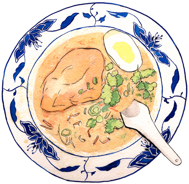 Everything within the bowl made perfect sense — the only thing I found to be confusing about the dish was how to use all the utensils in concert. I eventually settled on using the spoon for the soup, chop sticks for the noodles, and fork and knife for the chicken still on the bone.