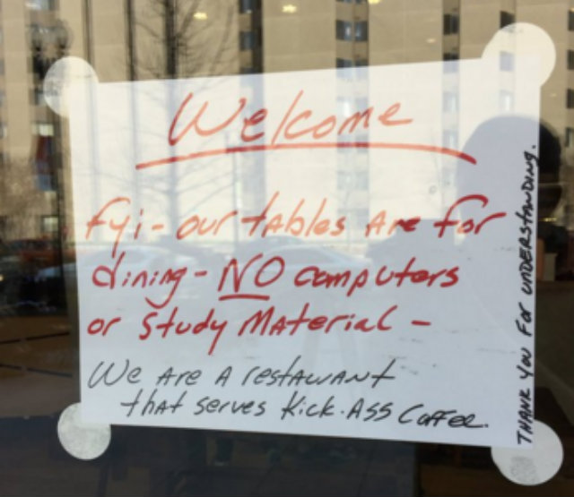 Lots of coffee shops have banned use of laptops over concerns that people would take up precious table real estate for hours with the purchase of one measly coffee. Some don’t even have an internet connection (as this writer learned the hard way at The Wyndown). But as Washington City Paper reported earlier this week, A Baked Joint posted a sign in its window that appeared to ban both computers and study material from its tables.