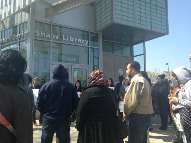 Demonstration outside Shaw Library. (Photo by Rachel Kurzius)