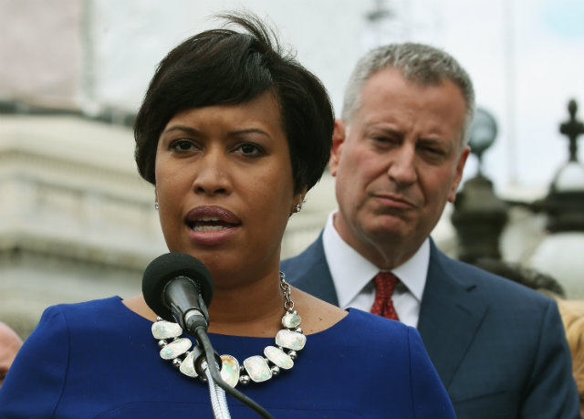 Mayor Bowser at a 2015 press conference with NYC Mayor Bill de Blasio, also part of the Mayors Against Discrimination coalition. (Photo by Mark Wilson/Getty Images)