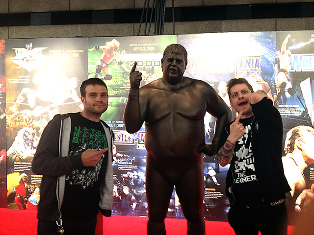 Pierce McLain and Fil Baird pose with a statue of “The American Dream” Dusty Rhodes (Courtesy Film Baird)