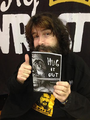 WWE legend Mick Foley approvingly holds a copy of Hug it Out (Courtesy D.C. Zinefest)“We have to travel a lot to see our favorite indie wrestlers,” Baird said. “I never thought I’d make major trips specifically to watch professional wrestling, but I’ve flown as far as New Orleans, Los Angeles, Las Vegas, and Dallas.”